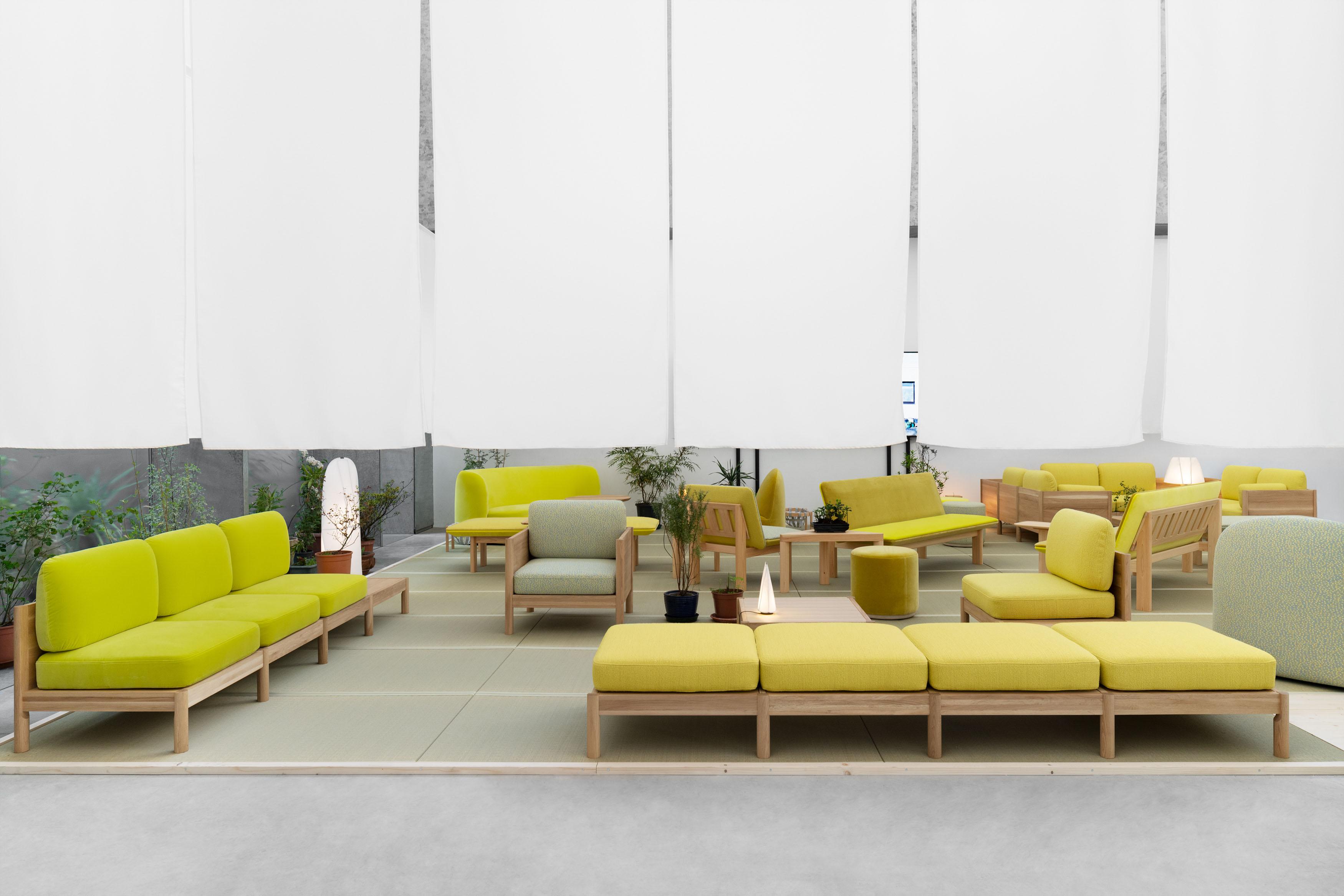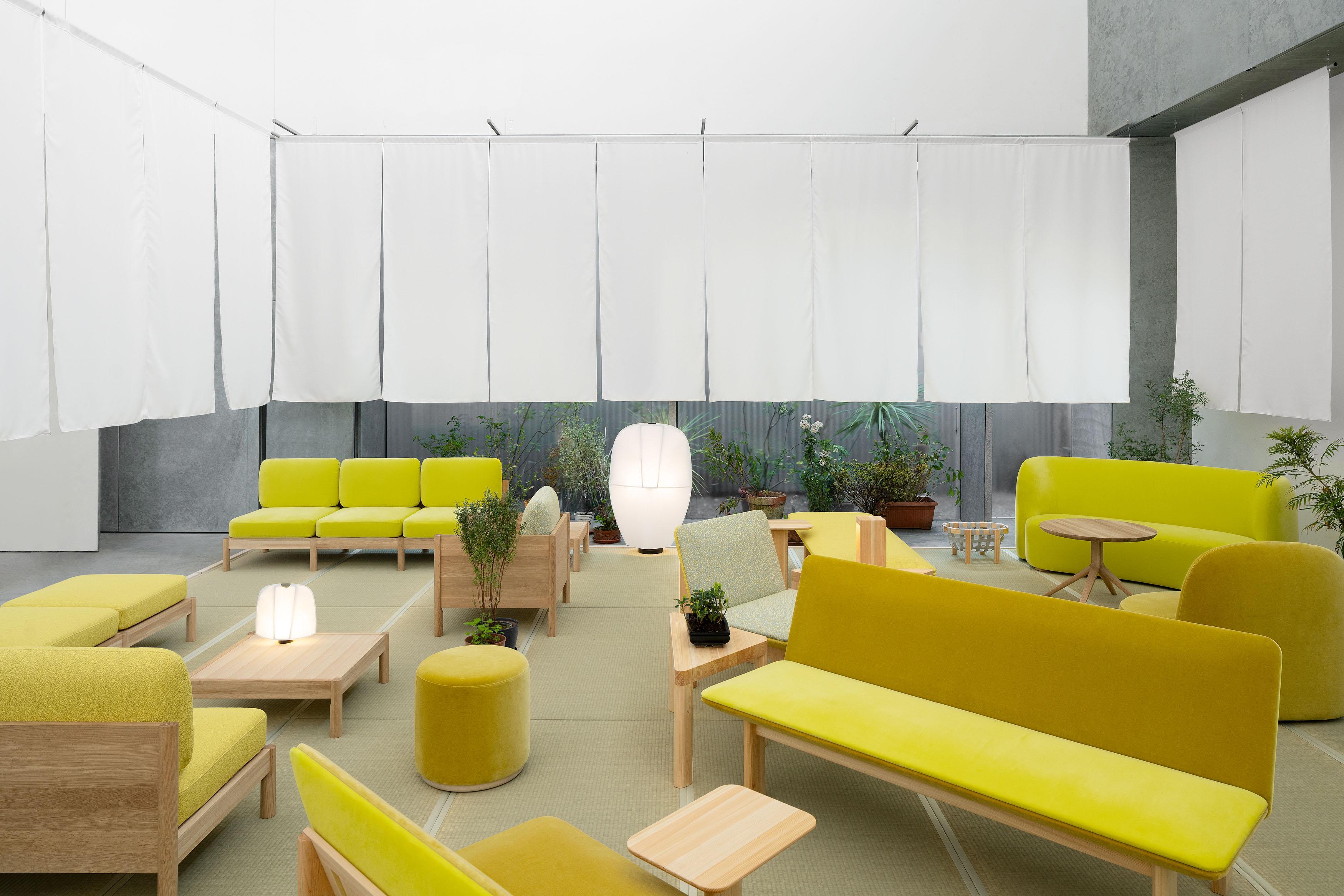 Karimoku Furniture’s brands KNS (Karimoku New Standard) and MAS present a conceptual lounge space featuring both new and classic items from their collections. Designed to resemble an interactive, natural landscape, with large sofa formations in a monochromatic yellow color scheme evoking a field of flowers. The floor, composed of 43 tatami mats, and surrounded by traditional Noren curtains, pays homage to the Japanese heritage of the brands. The lounge also contains a video installation “City Plants”, a collaborative project between Shinji Otani and Taisuke Koyama. Through two short films the artist explores how nature exists within urban environments, finding spaces in cracks in tarmac, in flowerpots on doorsteps, in urban parks and growing in forgotten corners of the city, seizing small gaps to grow in powerful, innovative ways. It is a celebration of nature’s strength and beauty, innovating even in challenging circumstances. Guests are invited to remove their shoes upon entering the space—a Japanese gesture that symbolizes relaxation and coziness, welcoming people to unwind.