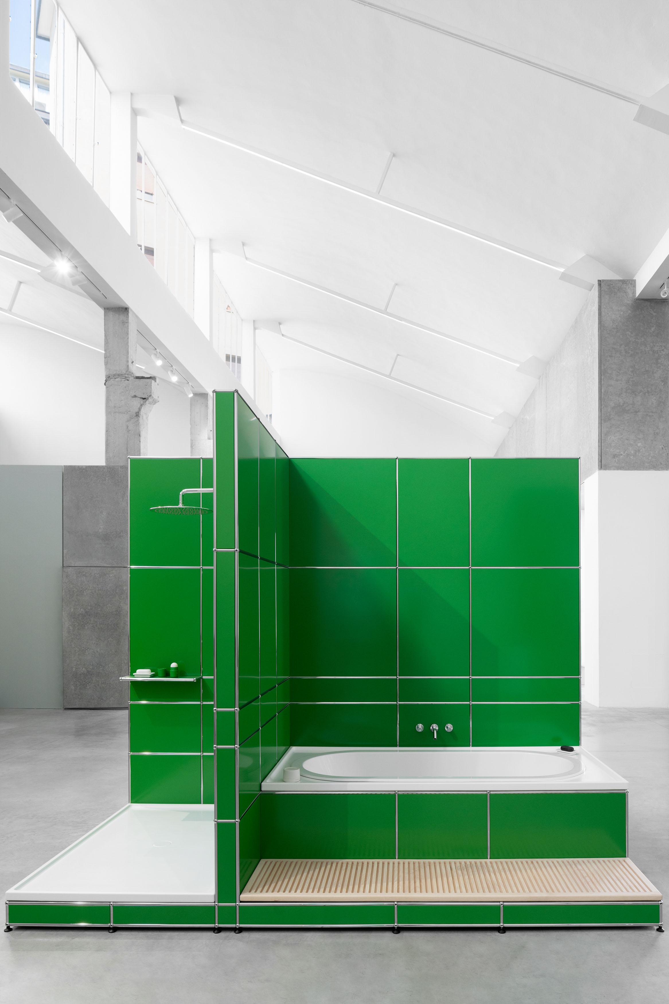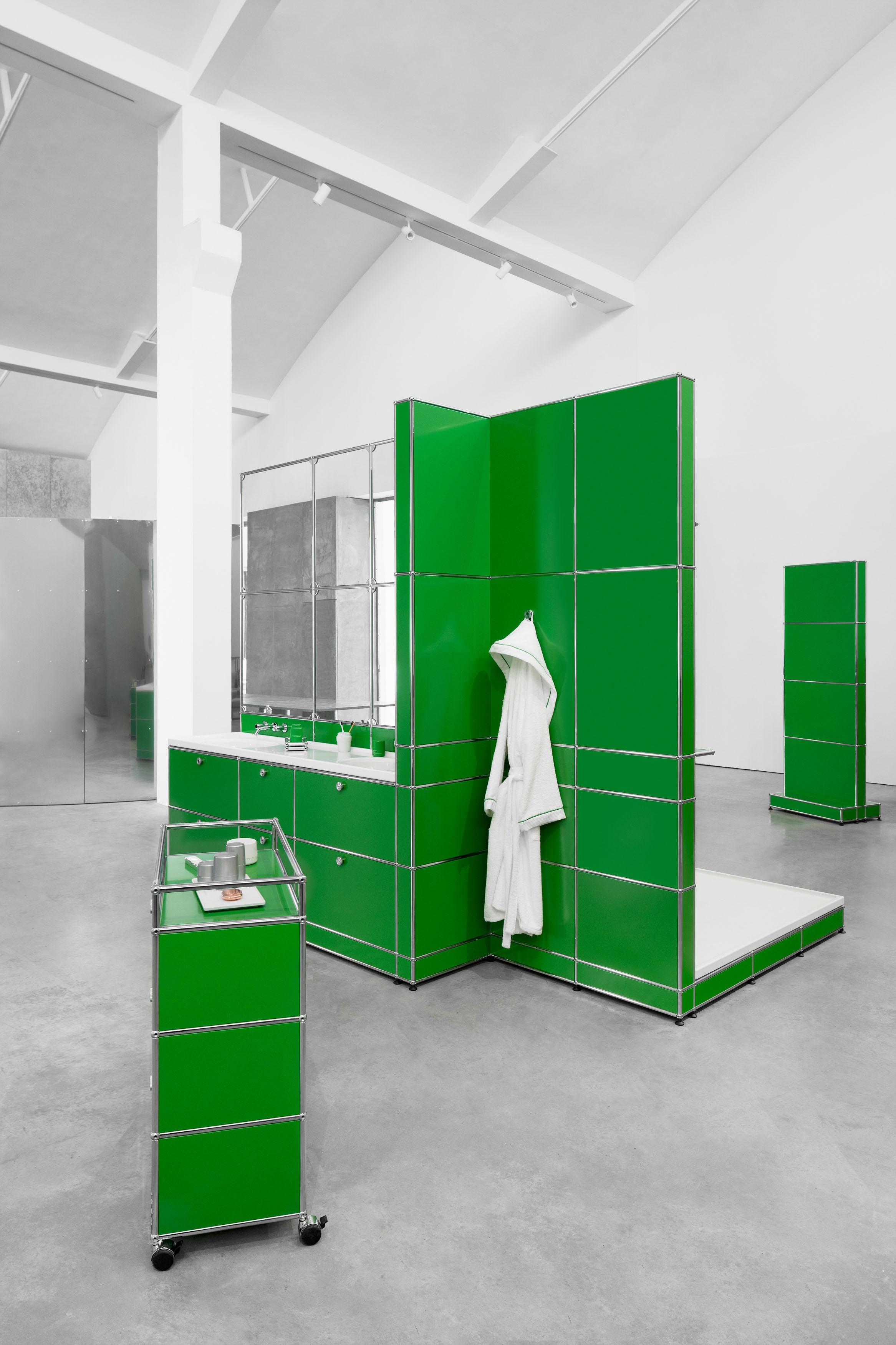 Humanrace by Pharrell and USM Modular Furniture reimagine the bathroom as a space of holistic well-being. Humanrace creates tools for living well and caring for body, mind, and spirit with intention—a daily routine that ritualistically begins and ends in the bathroom. A Swiss design icon for over 60 years, the USM Haller modular system provides the foundation for a freestanding bathroom structured around two central axis, with fixtures provided by Laufen. The open-concept design reflects a human-centered philosophy, while USM’s signature shade of green evokes renewal and balance as fundamental elements of a day well lived. Stocked with custom accessories and Humanrace’s all-gender skincare range, the visitors are invited to explore a new vision for the bathroom before continuing with their day.