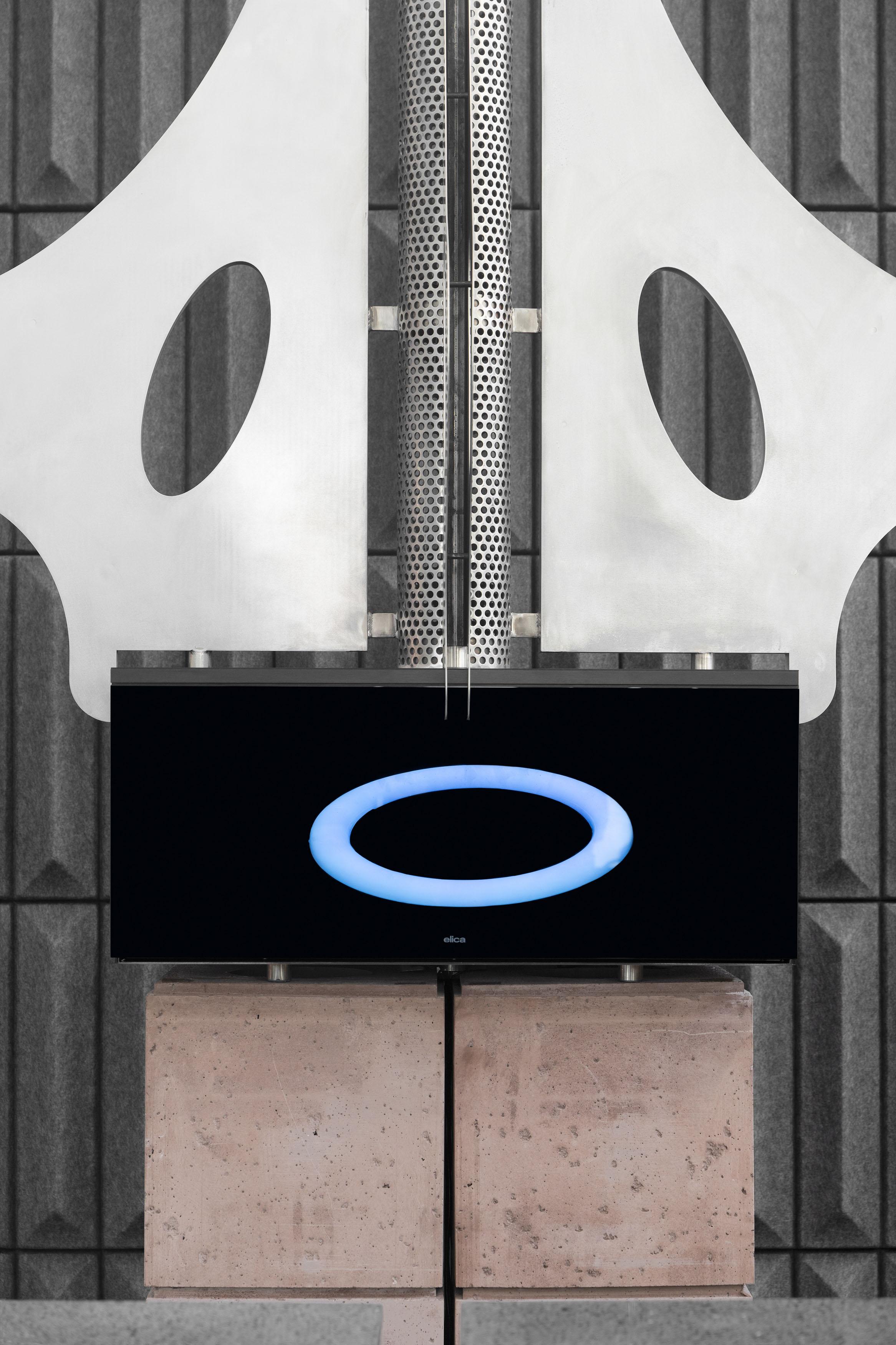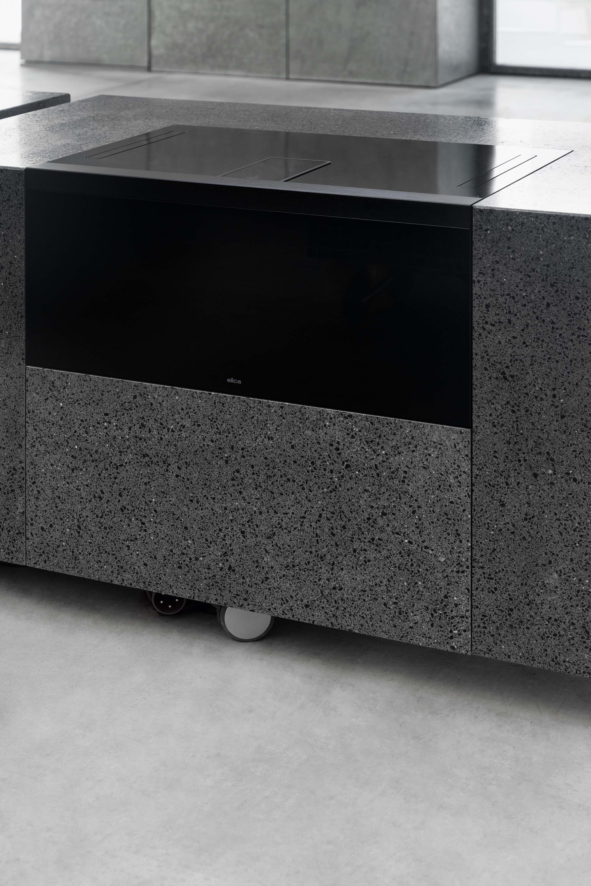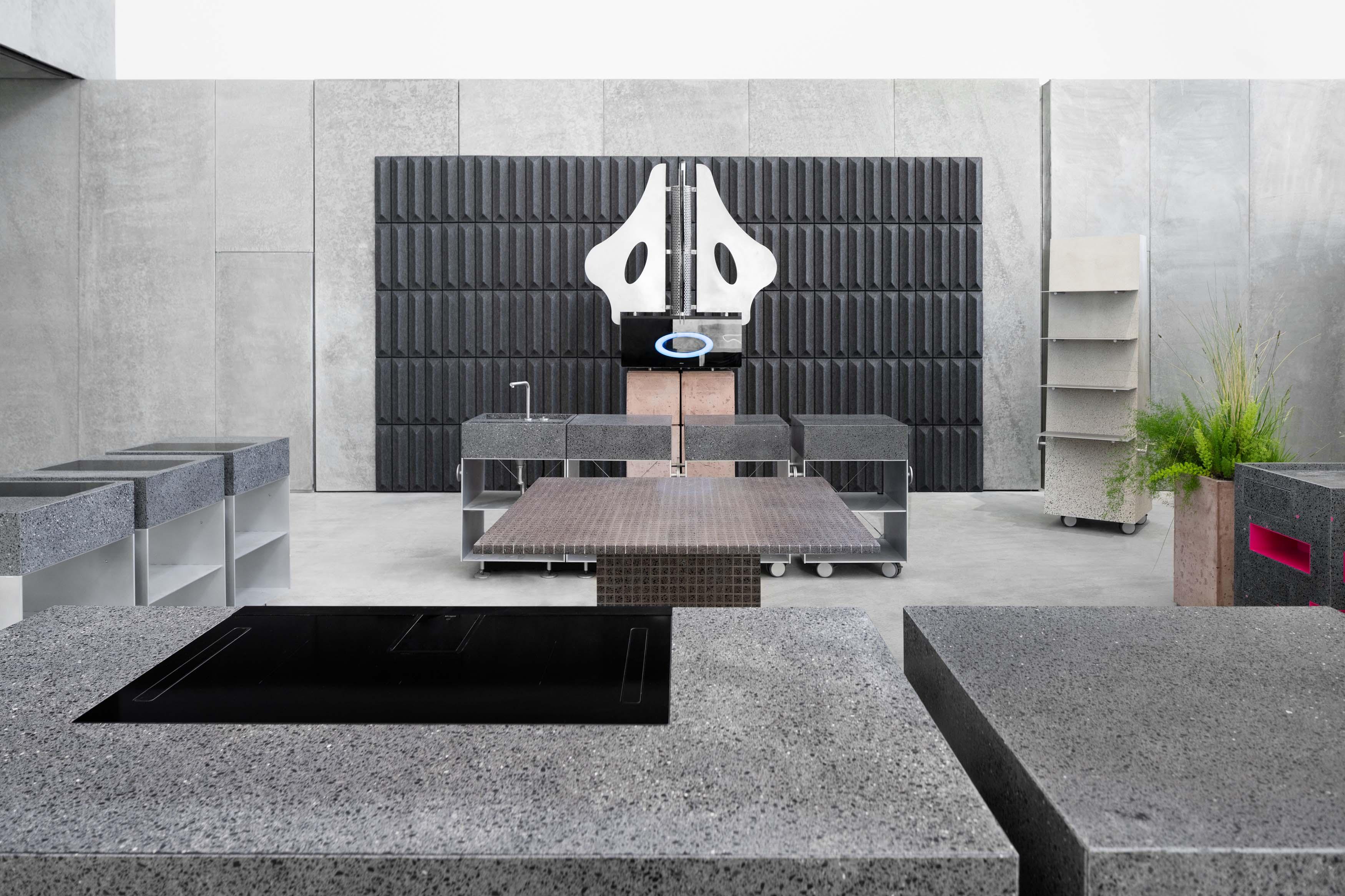 70Materia and Elica team up to present an interactive kitchen space activated by dinners and workshops throughout Design Week. A custom monolith in Progetto Basalto Levigato, created by 70Materia, plays host to Elica’s innovative LHOVTM, the first All-in-One appliance, which combines the functions of an oven, hob and extractor hood in a single appliance. Surrounding the centrepiece are the modules of 70Materia’s Satellite kitchen system, designed by architect Enricomaria Todaro, which travel on wheels and are joined together by magnets for ease of reassembly, creating a totally flexible approach to food preparation.