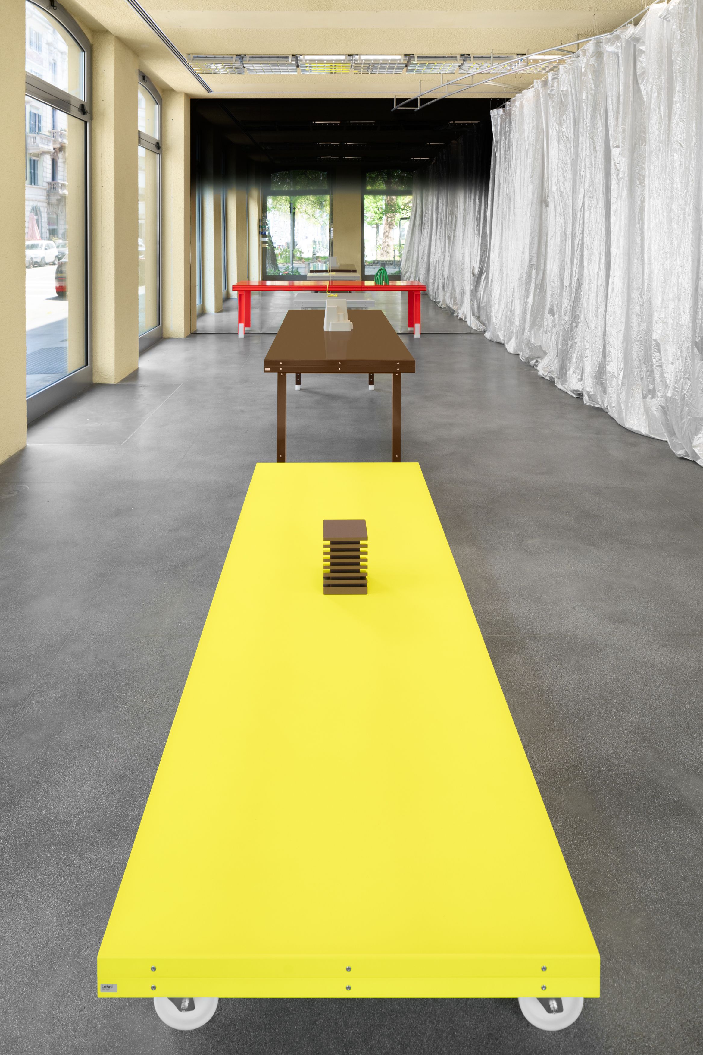 The minimalist construction features a perfect relation between use of material and stability. Newly updated by German designer Tim Schütze, the table has been transformed into a height-adjustable, ultra-contemporary table, housing the Capsule Plaza gift shop.