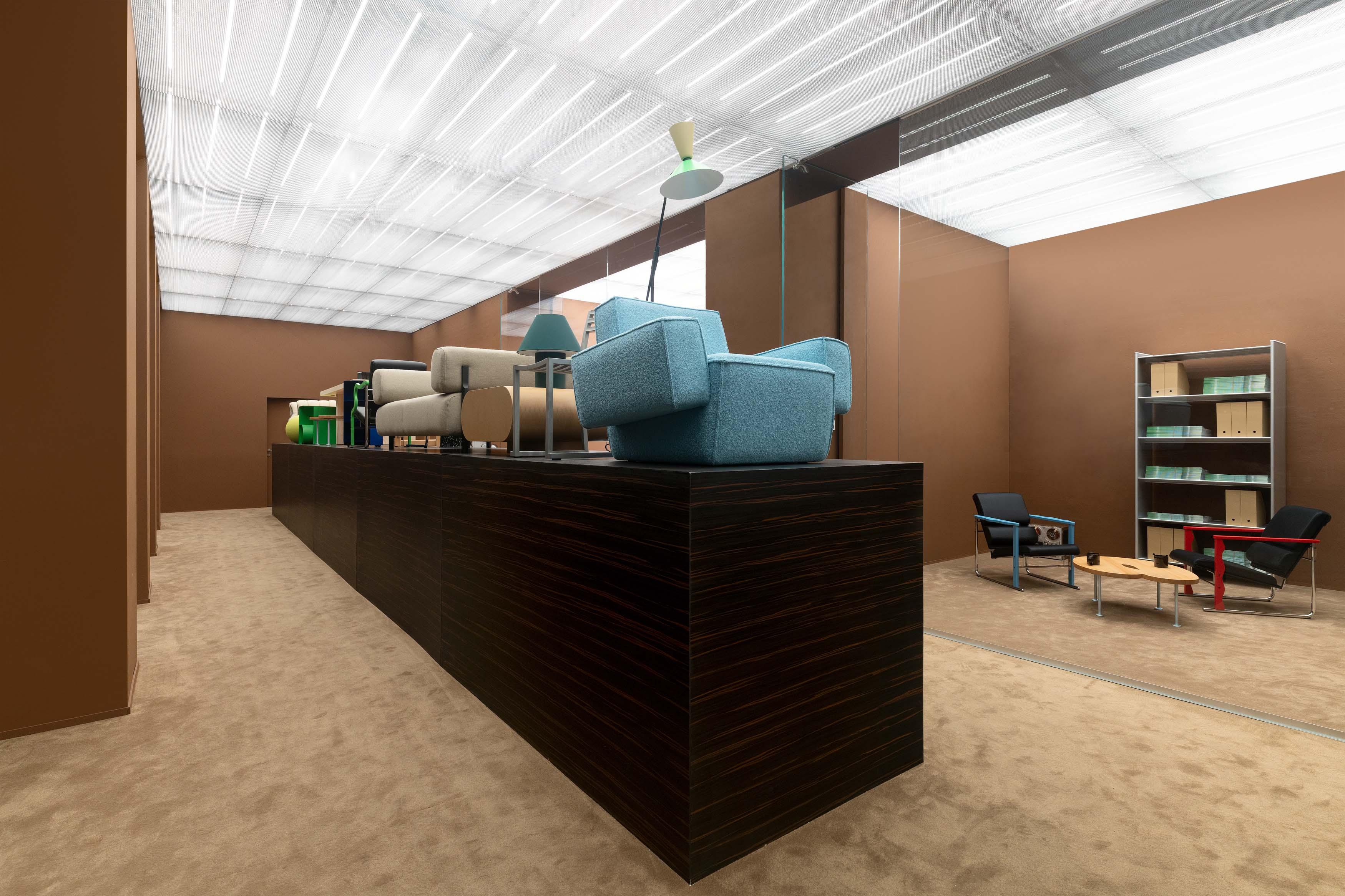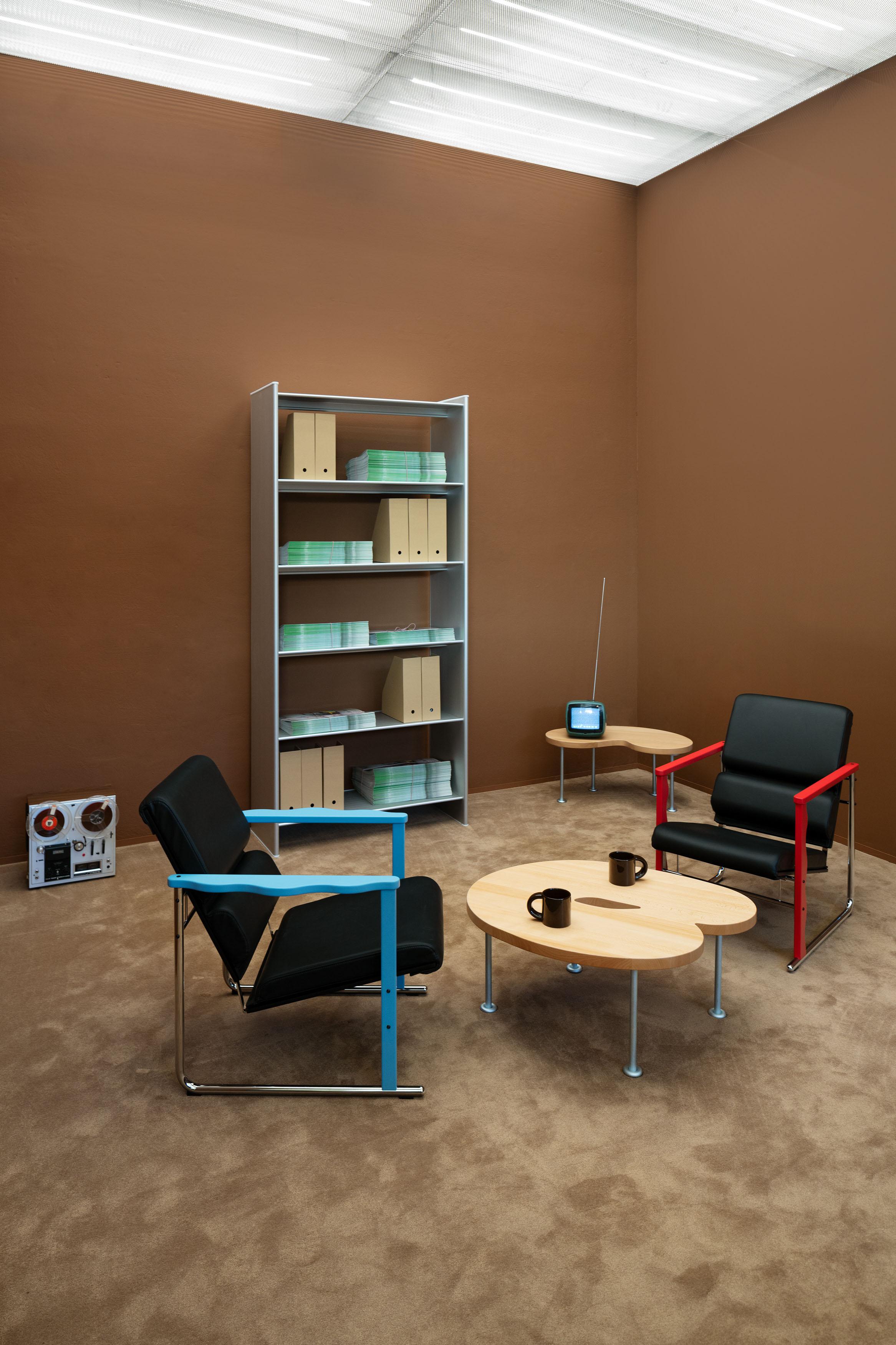 With an eye on the future, the two annex rooms are conceived as interactive vitrines dedicated to the company’s newest releases: the Great Sofa by Philippe Malouin, a modular design with a lounge-worthy presence, defines a space for reading, connecting, and unwinding, while the freshly reintroduced Experiment chair, a 1980s icon designed by Yrjö Kukkapuro, embodying a fearless avant- garde aesthetic, provides a semi-private space for discussion and research.
